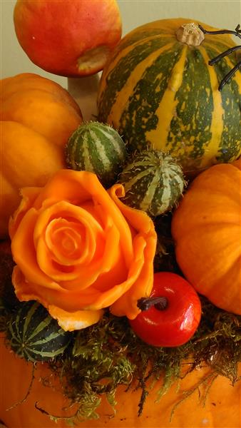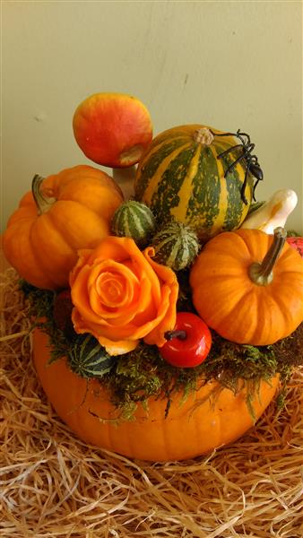 AVAILABLE NOW...For the novelty WOW factor this Halloween,why not choose one of Our REAL pumpkin arrangements .These are only available for a limited time so early ordering is advised ,The arrangement will be delivered in the days before Halloween.