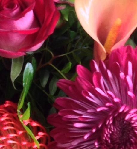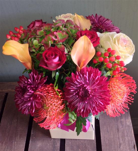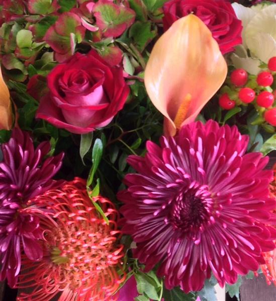 A warm mix of autumn pinks and reds including roses, berries and hydrangeas with a touch of the exotic.