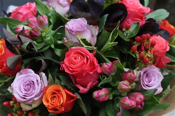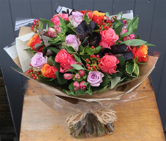 They’ll be bowled over with this stunning hand-tied bouquet full of fresh flowers in glorious seasonal colours. The combination of coral pink, lilac and orange looks really pretty, and the warmth and detail of these blooms reflects the exuberance of this time of year.